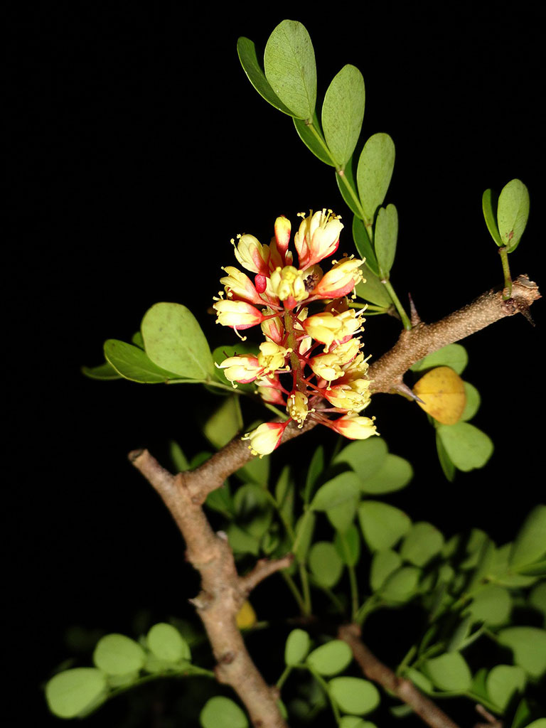 Il campeggio è una pianta sempreverde che si presenta come albero o arbusto, spesso con spine, e che raggiunge altezze fra i 3 e i 10 metri. Il legname è di colore rossastro con una lieve profumazione di violetta. Le foglie sono lunghe dai 2,5 ai 7,5 cm e hanno dalle tre alle 5 coppie di foglioline lunghe da 1 a 3 cm e larghe da 1 a 2,5 cm. I fiori hanno 5 petali e una corolla bianca. Il frutto è una drupa larga circa 1 cm.