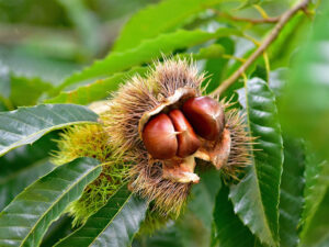 E’ una delle più importanti essenze forestali dell'Europa meridionale, in quanto ha riscosso, fin dall'antichità, l'interesse dell'uomo per i suoi molteplici utilizzi. E’ un albero longevo che può raggiungere i 30-35 metri di altezza e i 6-8 metri di circonferenza del fusto. Il castagno è una pianta monoica, ossia presenta sullo stesso albero, sia fiori maschili (riuniti in amenti), sia fiori femminili (solitari o aggregati in numero di 3-5 in un involucro verde chiamato cupola), le foglie sono lunghe e seghettate, il frutto è un achenio comunemente chiamato castagna. Gli acheni sono racchiusi, in numero di 1-3, all'interno di un involucro spinoso, comunemente chiamato riccio.