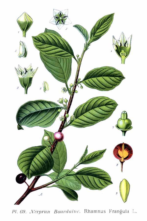 La corteccia della frangola contiene glicosidi antrachinonici, che stimolano la peristalsi intestinale