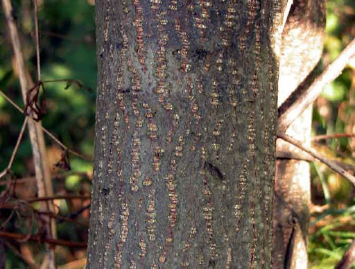 La corteccia è grigio violacea o grigio piombo, con numerose lenticelle bianco grigiastre rotonde nei rami giovani e allungate trasversalmente nei vecchi.